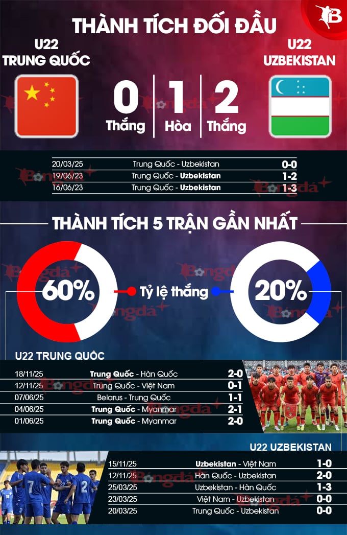 - Ít thẻ vàng: 5/5 trận gần nhất của U22 Trung Quốc có ít hơn 4 thẻ vàng. 4/5 trận gần nhất của U22 Uzbekistan có kịch bản tương tự.